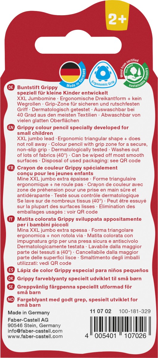 Naast papier hecht de wateroplosbare kleur ook op karton en glas, waardoor bijvoorbeeld ook ruiten tot het creatieve terrein kunnen behoren. Grippy is dermatologisch getest, kan van veel gladde oppervlakken worden afgewassen en kan bij 40 graden uit de meeste textielsoorten worden gewassen. Hout uit FSC-gecertificeerde duurzame bosbouw. Kartonetui met 4 assorti pastelkleuren.
